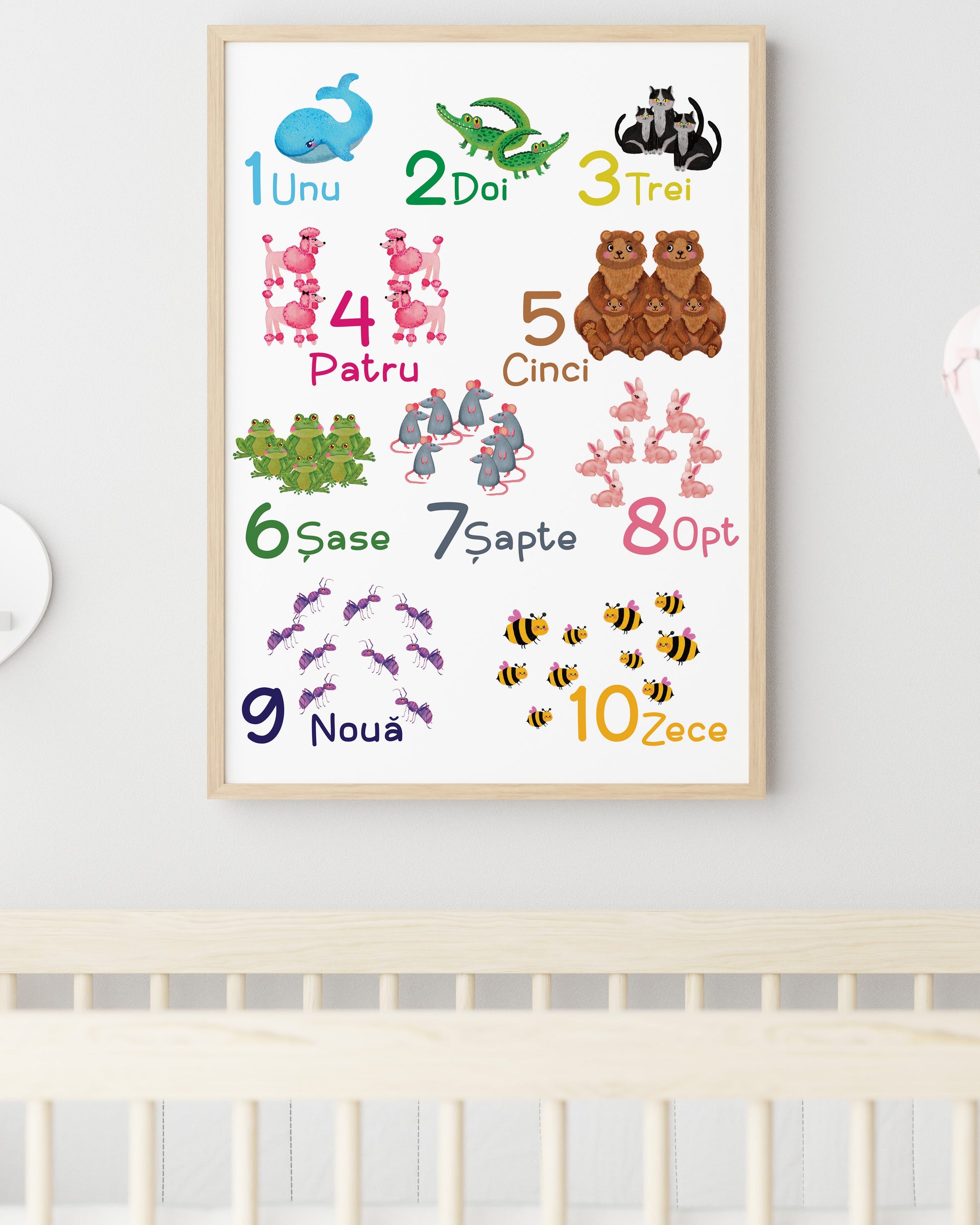 Poster educațional cu numerele1–10 ilustrate în acuarelă, alături de animăluțe prietenoase.