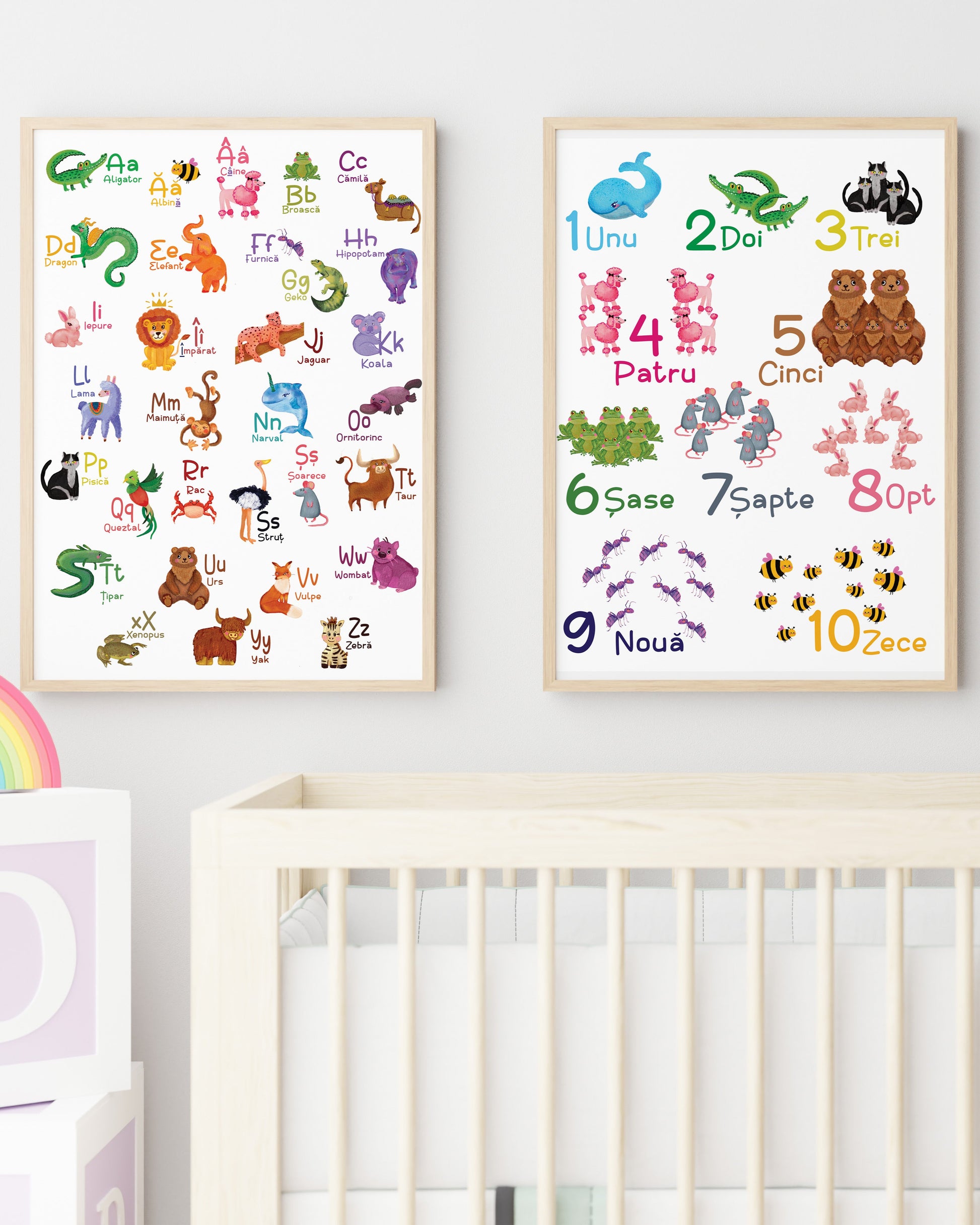 Set 2 postere – Alfabetul și Numerele 1–10, ilustrate cu animale colorate în stil watercolor. Educație prin joacă și culoare pentru cei mici.
